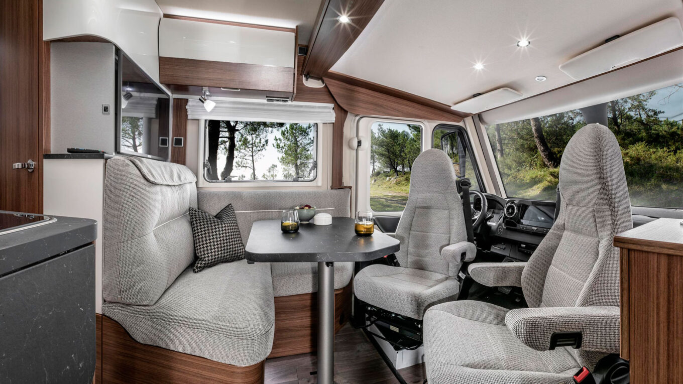 Den helintegrerede autocamper føles som en luksuriøs stue på hjul, med stor panoramafront, der giver en fantastisk udsigt. Forsæderne kan drejes og integreres i en rummelig og behagelig siddegruppe. Køkkenet er veludstyret med flere blus, stort køleskab og god bordplads, så det er nemt at tilberede måltider undervejs.